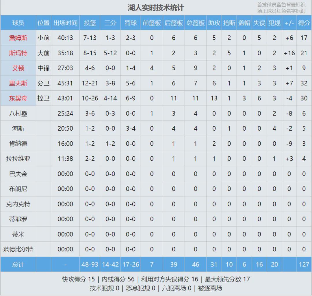 湖人前场边线球,东契奇面对夹击从容不迫,底线中距离后仰命中,只留给掘金0.5秒。小哈达威仓促出手不中,湖人127-125险胜掘金。里夫斯32分7板6助、东契奇30分11板13助3帽;戈登27分5板2帽、约基奇24分16板14助5断。
